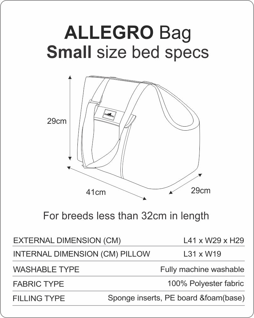The Allegro is specifically crafted for petite companions to ensure a snug and secure ride. Please measure your pet from the base of the neck to the base of the tail before purchasing.
