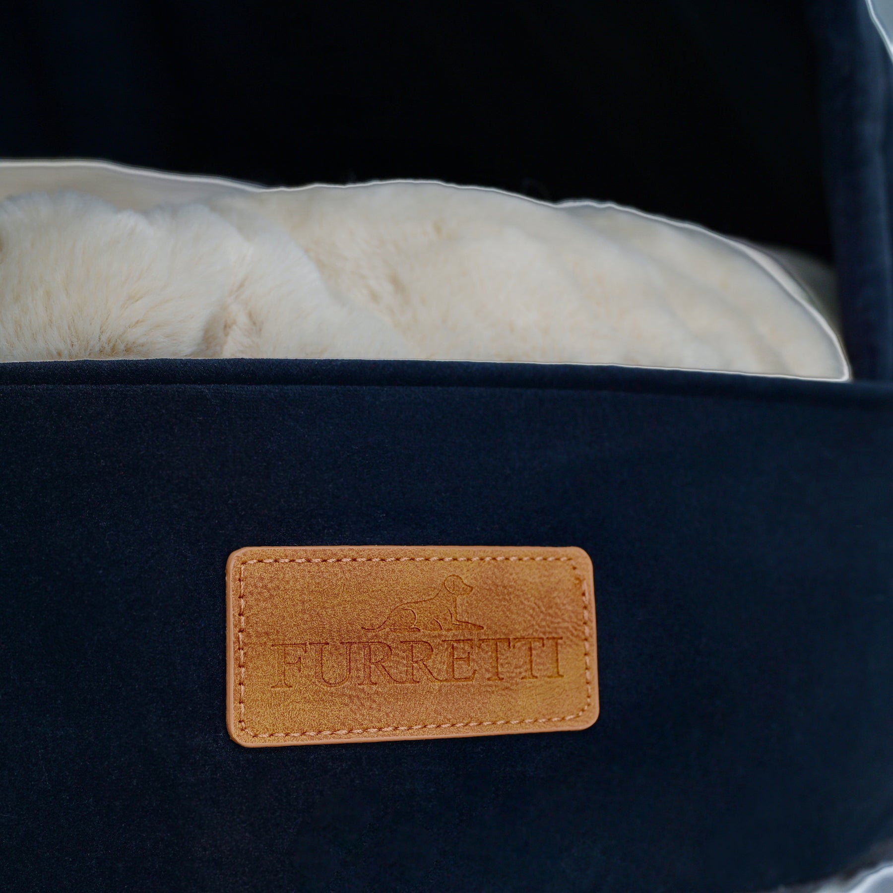 Experience the ultimate in nesting comfort with the Volto Dog Bed from Furretti. Designed for dogs who crave security and warmth, the Volto offers a unique 2-in-1 design that functions as a deeply plush covered igloo bed or a traditional open bolster nest. It is the definition of premium relaxation, finished in a sophisticated palette of deep navy and creamy white.