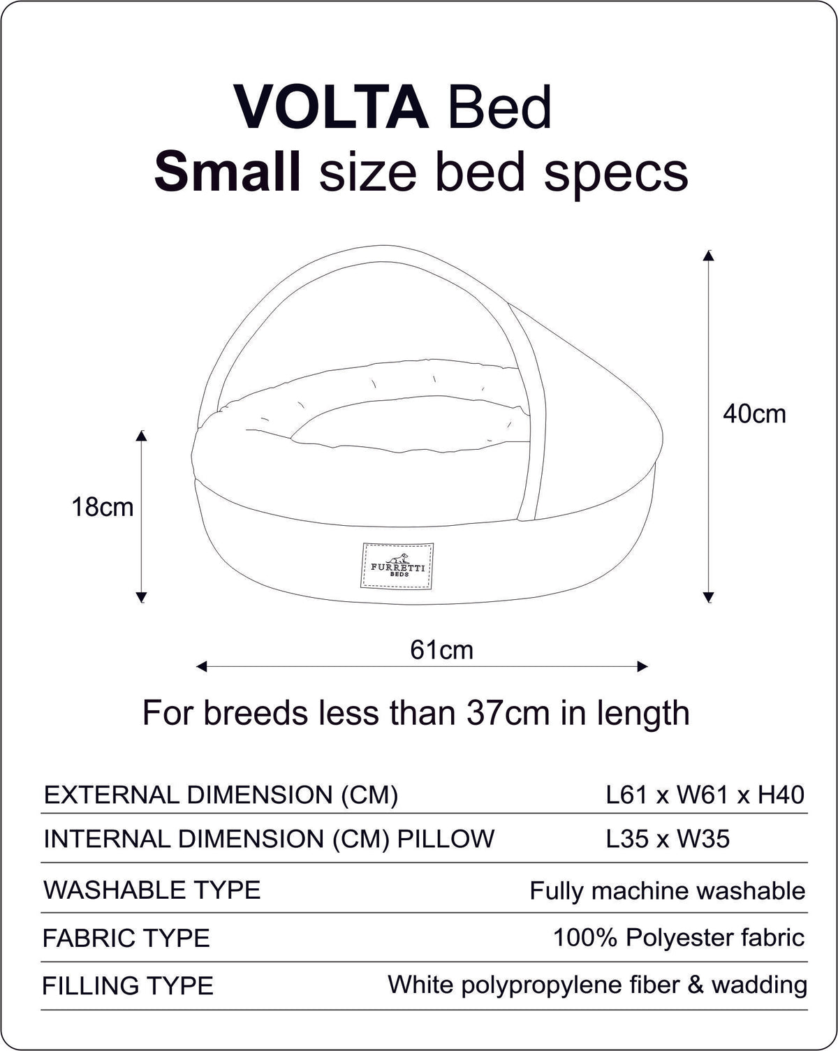 Finding the right fit for your Volta Bed is simple. The Small size is specifically designed for petite breeds up to 37cm long, like Chihuahuas or Toy Poodles, offering a cozy, hooded retreat.